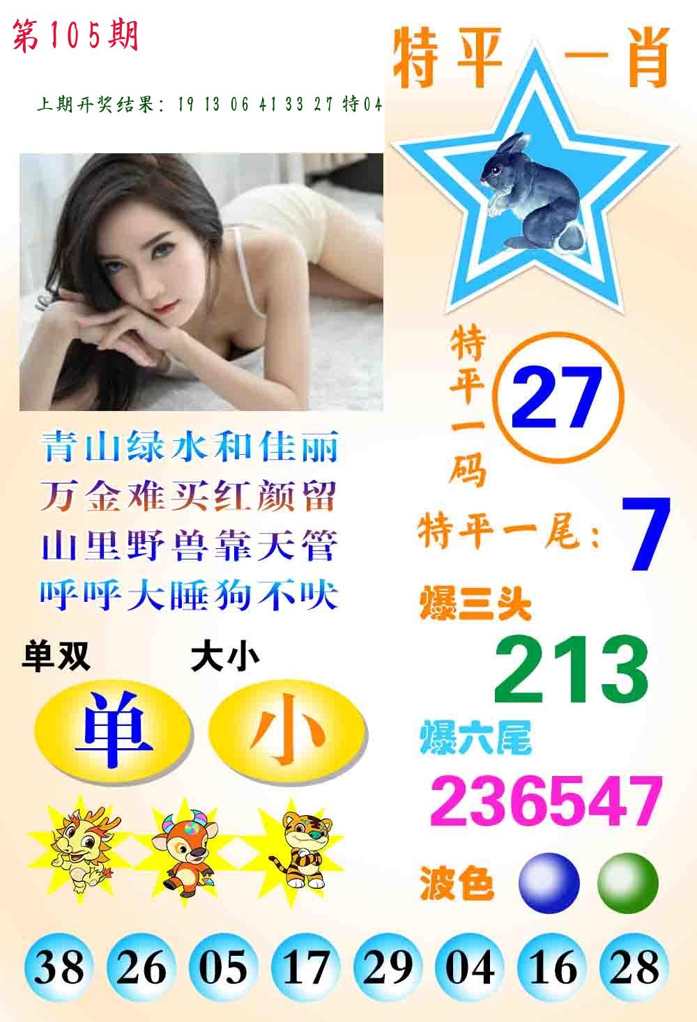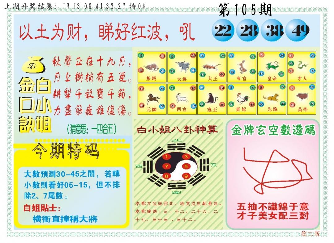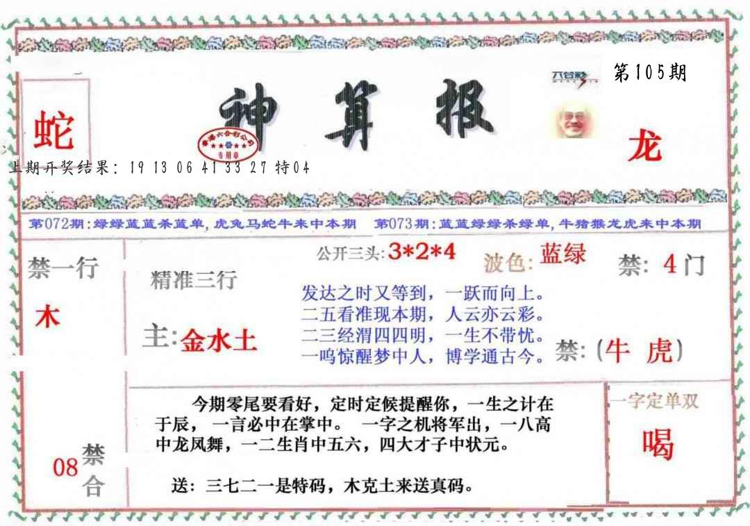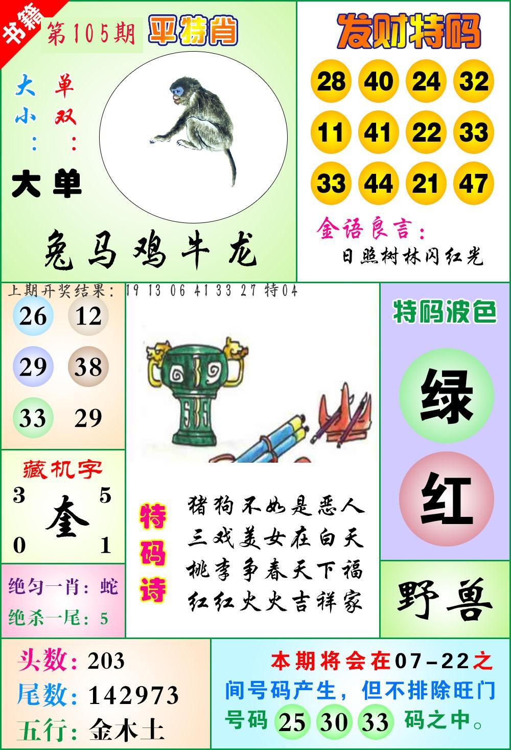 105期绝杀一波 【绿波】 开 38蛇错 |