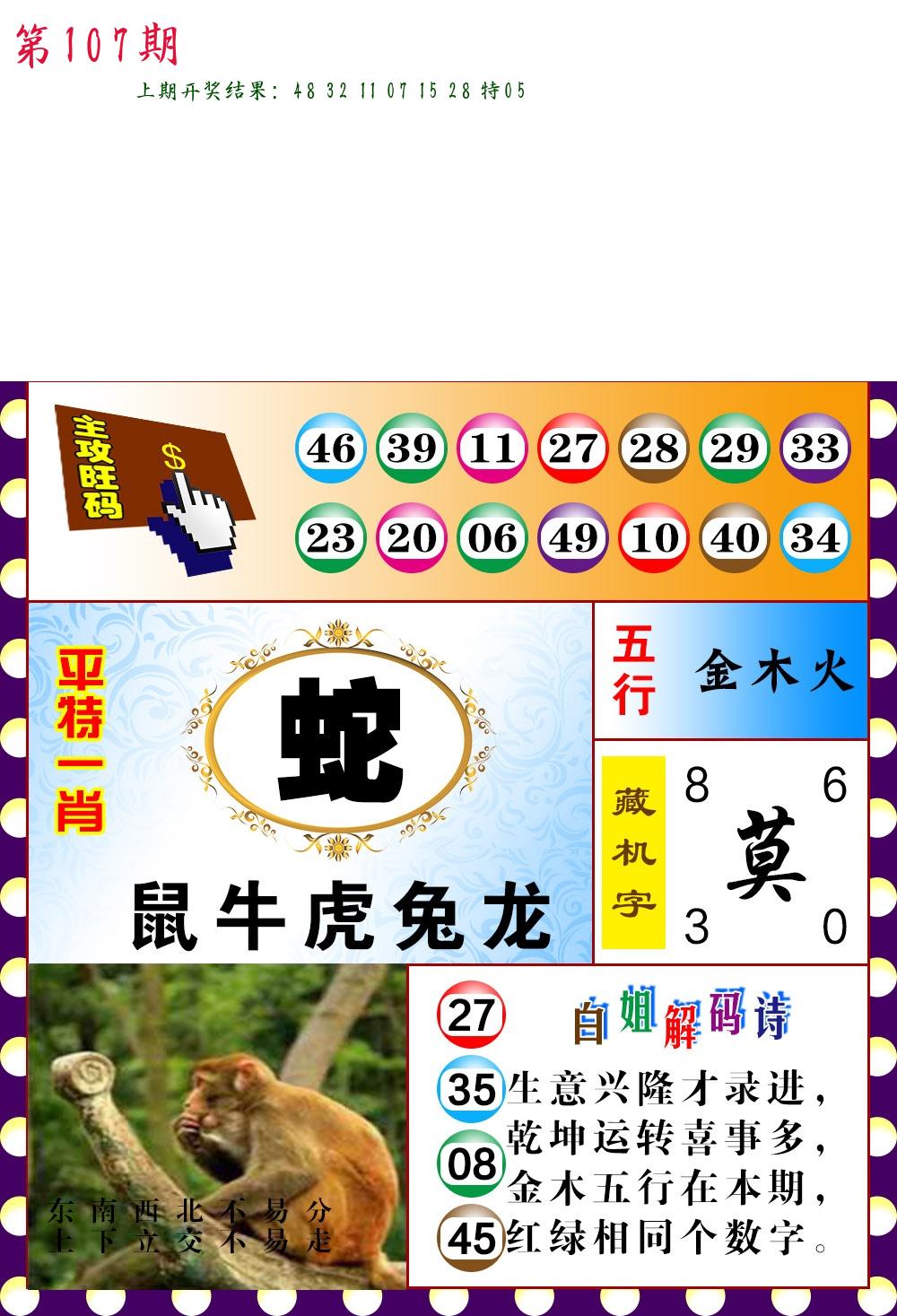 | 107期推荐五肖: 猪马鼠龙蛇 ~~稳准狠 |